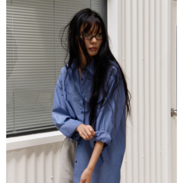 オーバーサイズのシャッツがシルエットをよく見せます。シャツの上にレイヤードトップスを合わせるもオススメです。