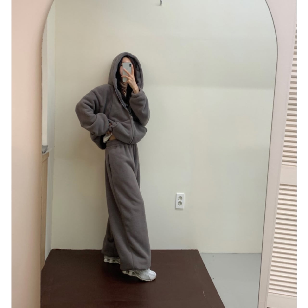 ふんわりとしたフリース素材、フードジャケットとパンツのセットアップ