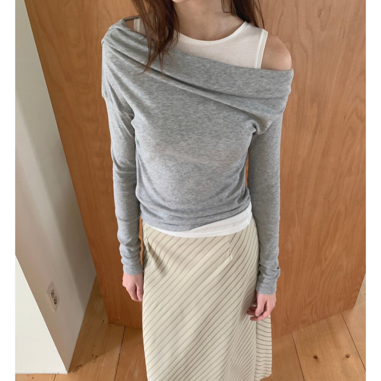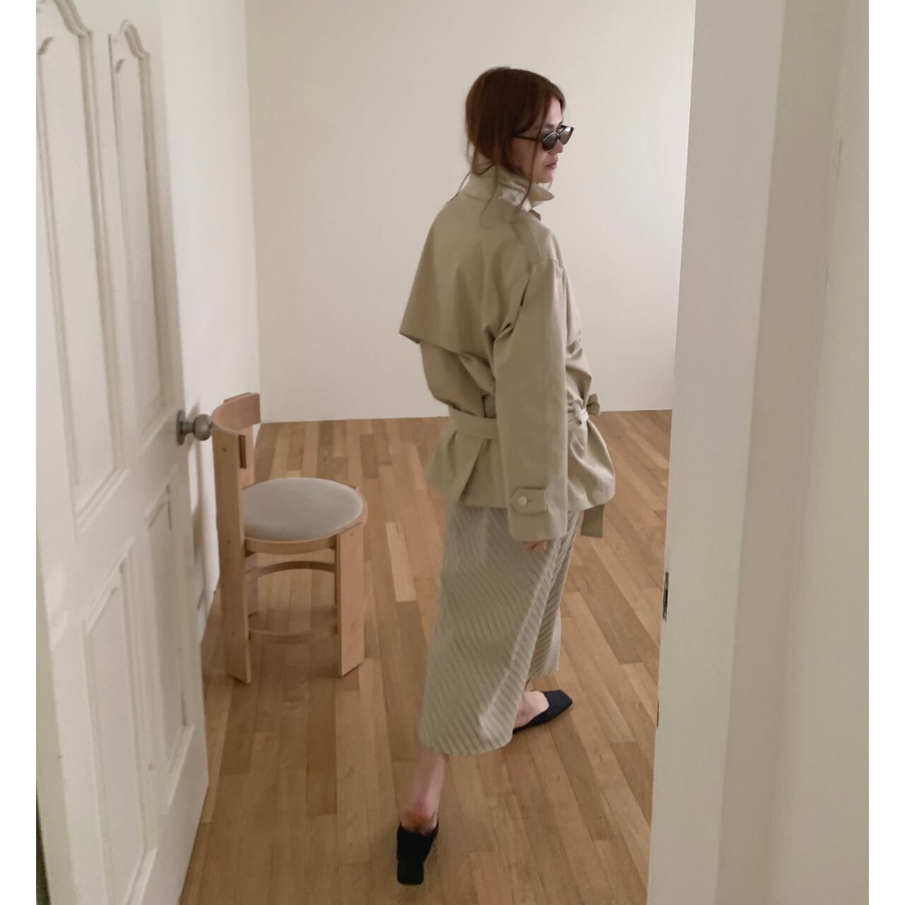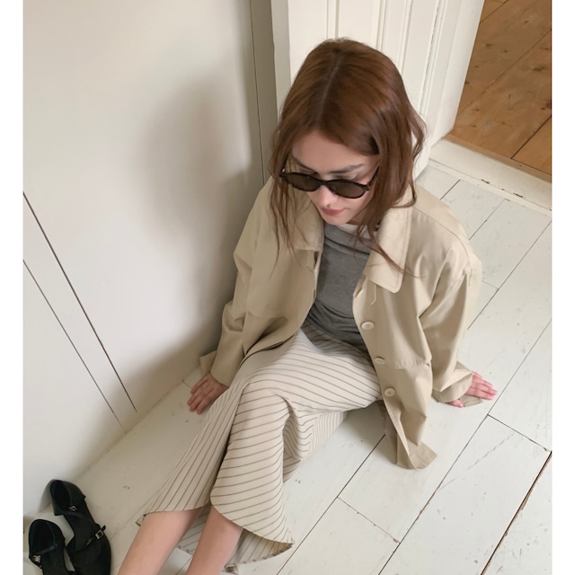 ストレートシルエットで広がりすぎず、上品な一枚。