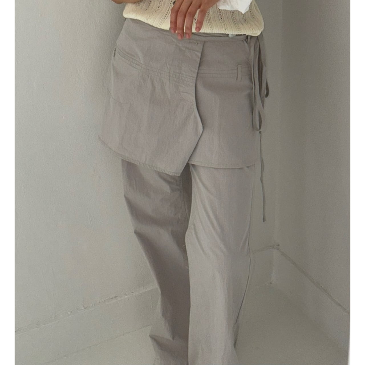 スカートとパンツをレイヤードしたようなデザインが今ぽい!カジュアルながらモードムードのスカートパンツは、足回りに余裕のある幅感で快適な履き心地です。