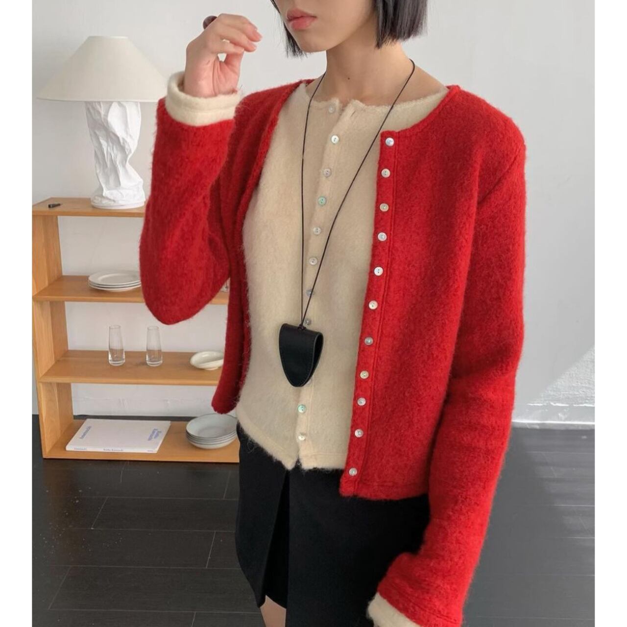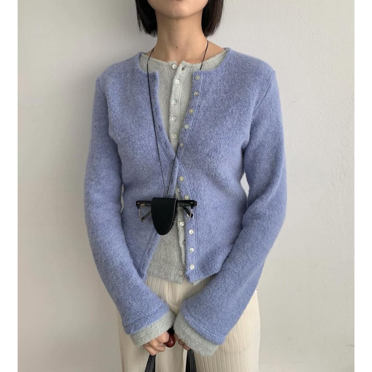 レイヤードしたような一枚カーディガン。